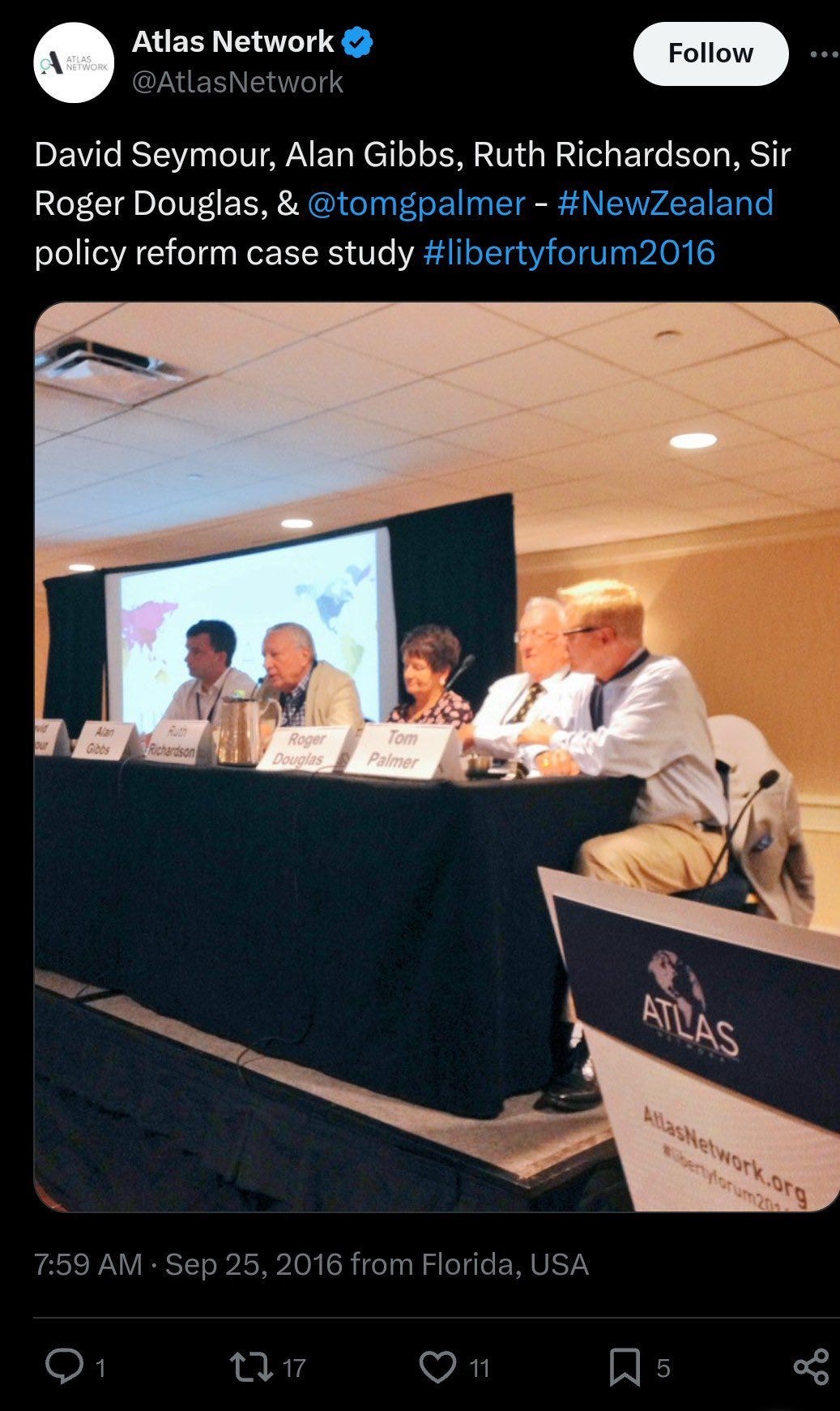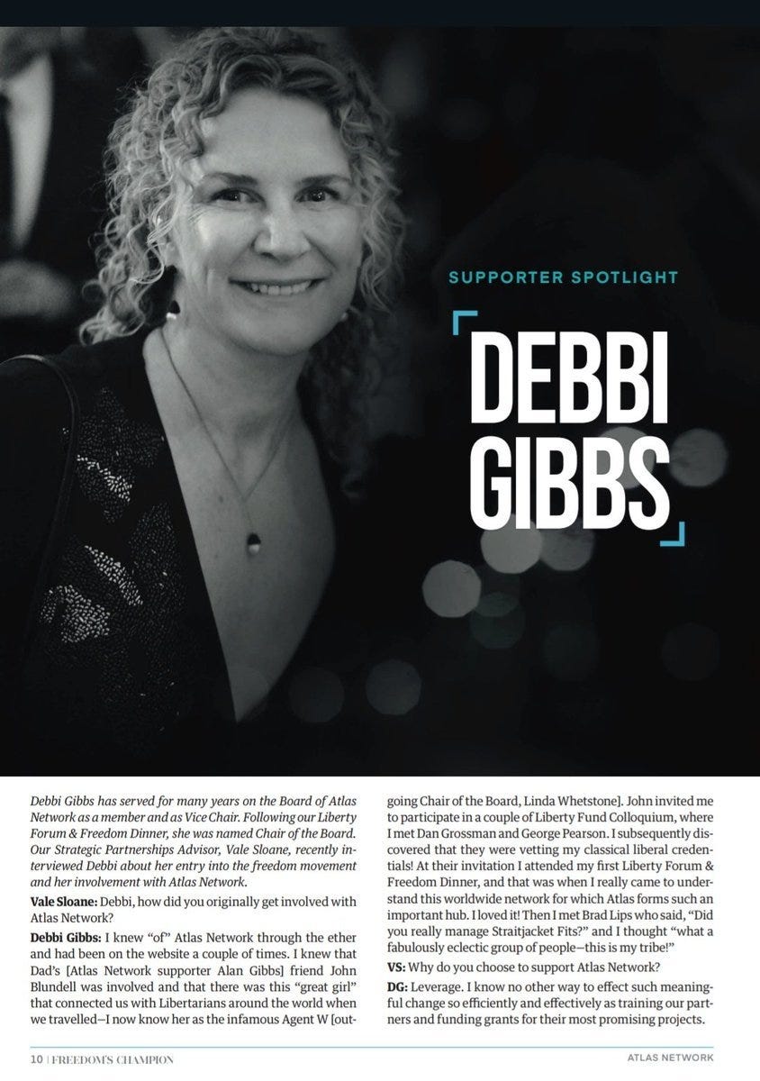 Prospective Atlas Network underlings can go into the global system, intern at a few different think tanks, go to some training sessions, and meet likeminded people. They come out with experience in spin doctoring, pushing talking points, and dirty politics tricks. They can then go set up their think tanks at home with initial support from Atlas, before quickly connecting to favourable domestic interests. Any guesses who the current Atlas Network chair is? Why, it’s Debbi Gibbs, Alan Gibbs’ daughter.